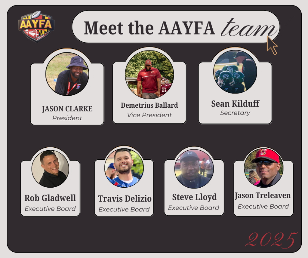 The Anne Arundel County Youth Football Association (AAYFA) is dedicated to empowering young athletes through the game of football by fostering a safe, inclusive, and competitive environment. Our mission is to build character, encourage teamwork, and promote physical fitness while teaching the values of respect, discipline, and sportsmanship. We are committed to nurturing the potential of all our athletes - on and off the field - through positive mentorship, community engagement, and a love for the game.
